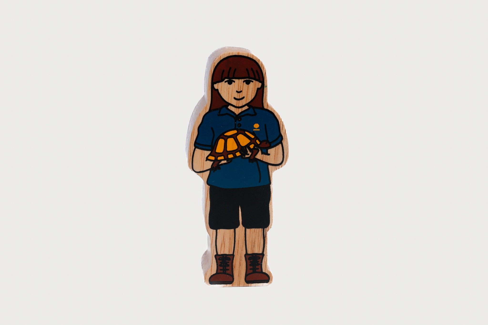 Painted on both sides with vibrant, non-toxic colours, the front shows a female animal keeper holding a tortoise, while the reverse shows her back. The super chunky 25mm thickness makes it easy for little hands to grasp and play with, encouraging motor skill development and storytelling.